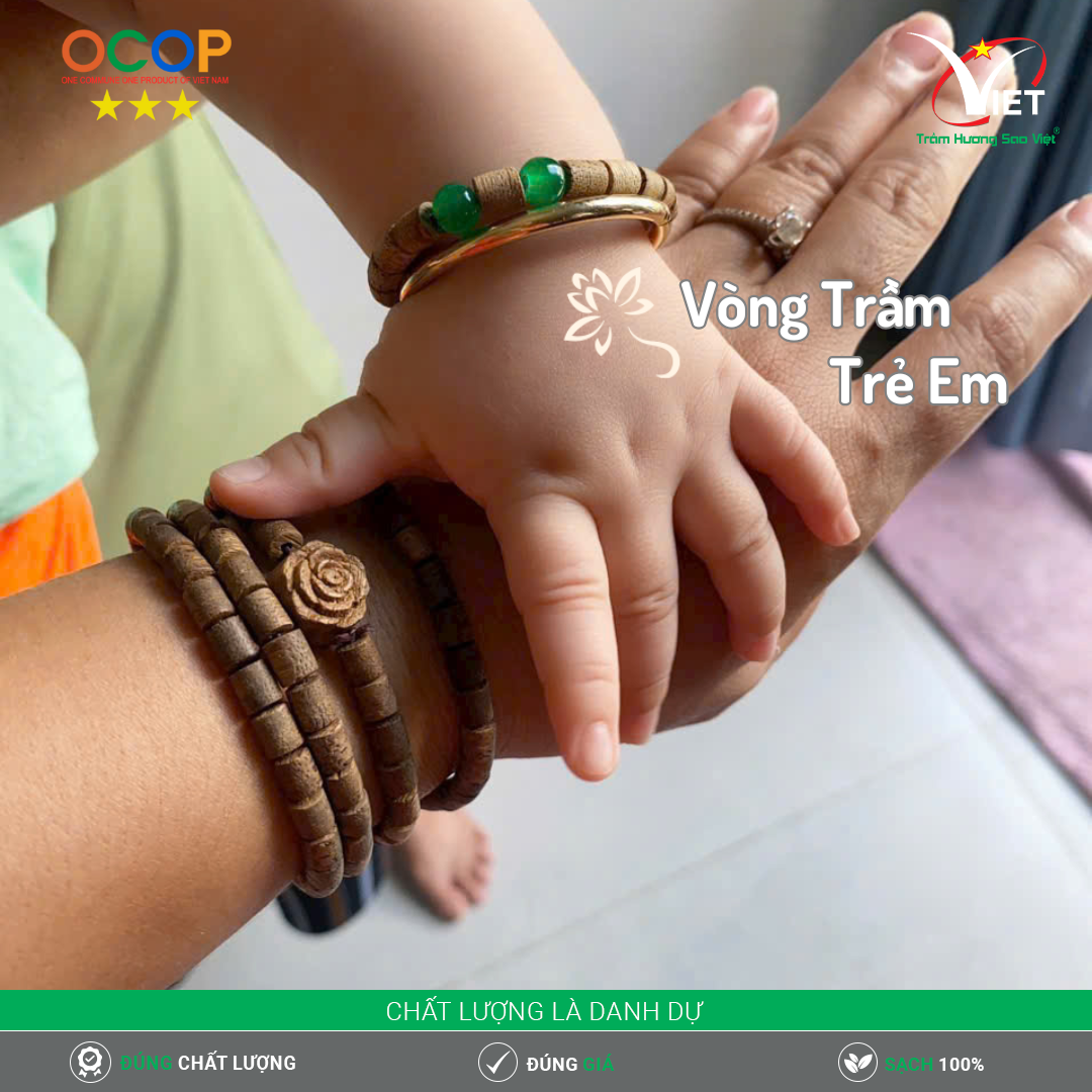 Vòng Trầm Hương Trẻ Em của Trầm Hương Sao Việt là món quà thiên nhiên tinh túy dành riêng cho các bé. Được chế tác hoàn toàn từ trầm hương tự nhiên 100%, vòng không chỉ là món trang sức đáng yêu mà còn mang lại năng lượng tích cực, giúp bé được bảo vệ, an yên và may mắn.